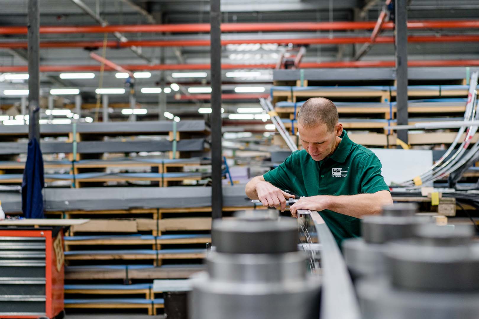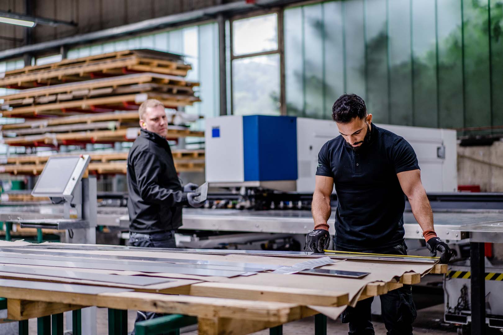 • Lager & Qualitätskontrolle: vollautomatisch gesteuertes Hochregallager mit 1.200 Lagerplätzen für Langgutkassetten, Wareneingangskontrolle (z. B. Messung von Glanzgrad, Beschichtung, Profilen etc.)