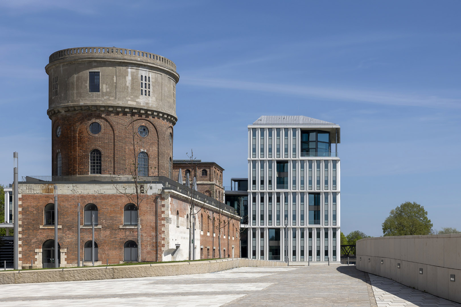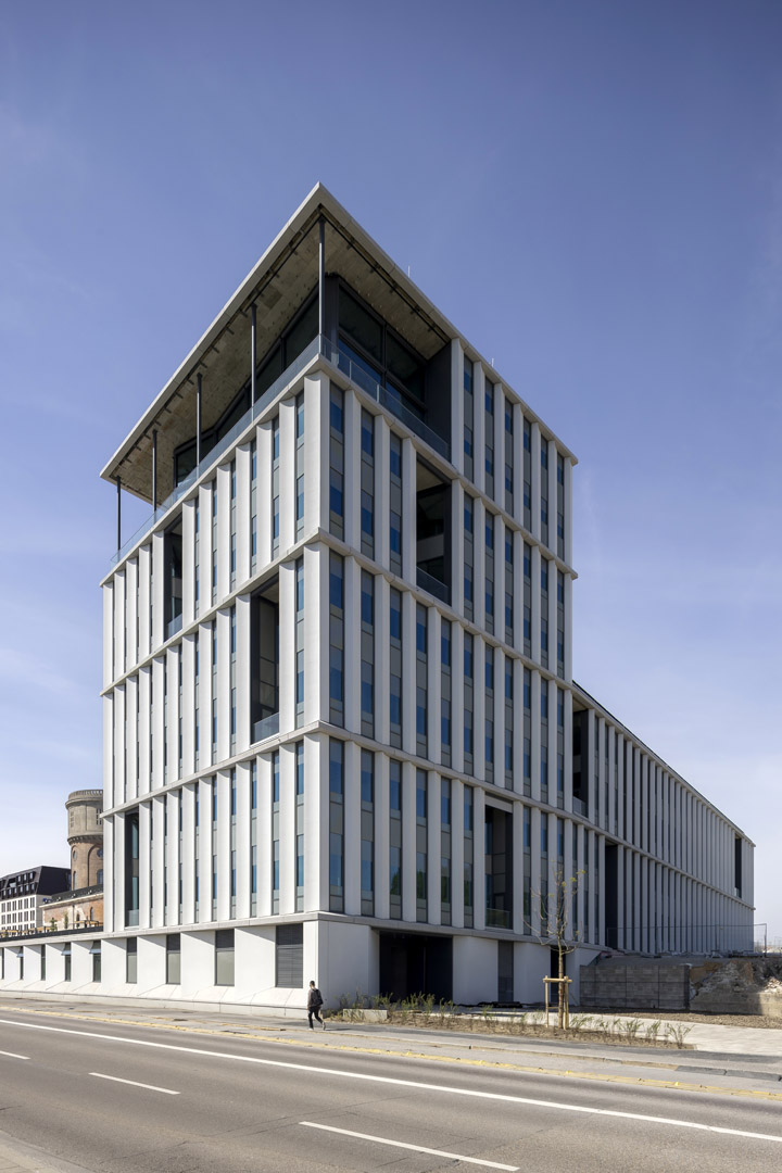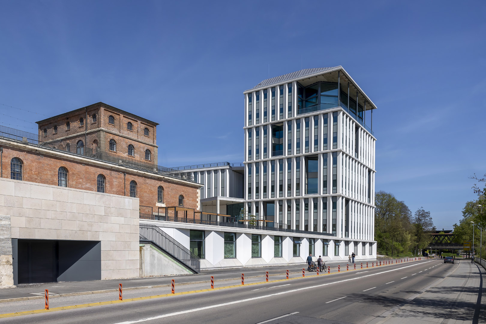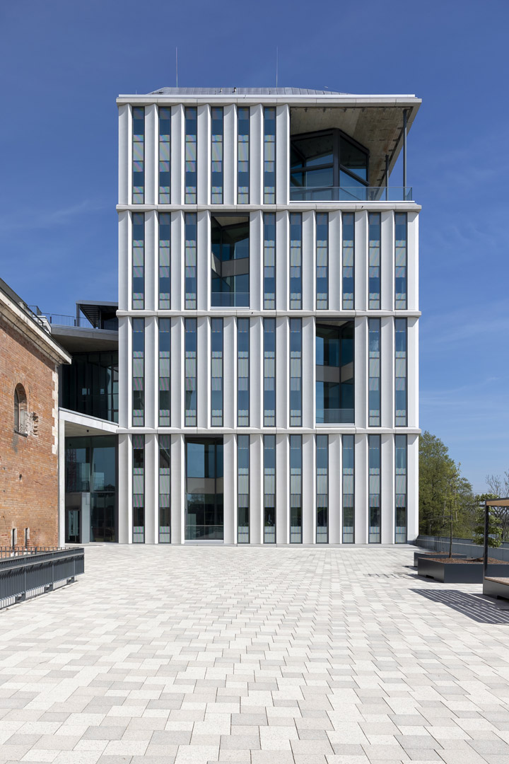 Architektur führt einen Dialog zwischen Alt und Neu. Im Ingolstädter „Quartier G – Alte Gießerei“ entsteht ein neues Zentrum für Innovation, Wissenschaft und Kultur. Bauliches Herzstück sind das 1847 eingeweihte Festungsbauwerk Kavalier Dalwigk und der Neue Dalwigk, die als Gesamtensemble zwischen 2019 und 2023 saniert respektive erbaut wurden. Lange Jahre hatte das historische Ziegelbauwerk mit dem 15 Meter hohen Wasserturm als Geschossfabrik und Geschützgießerei gedient. Heute beheimatet es das digitale Gründerzentrum für die Region Ingolstadt und zieht die Menschen insbesondere bei schönem Wetter in Scharen auf Dachterrasse und Aussichtsplattform. Der benachbarte Baukörper des Digitalen Gründerzentrums, bestehend aus einem 4-geschossigen Langbau mit begehbarem Flachdach sowie einem 8-geschossigen Turm mit Panoramafront und Außenterrasse unterhalb des Daches, bildet das architektonische Pendant. Über zwei Ebenen angeordnete, gesäuerte Sichtbetonelemente unterstreichen die vertikale Gliederung der Fassade. Verbindendes Element zwischen Alt und Neu ist ein langgezogenes, parallel zur Donau verlaufendes Sockelgeschoss.