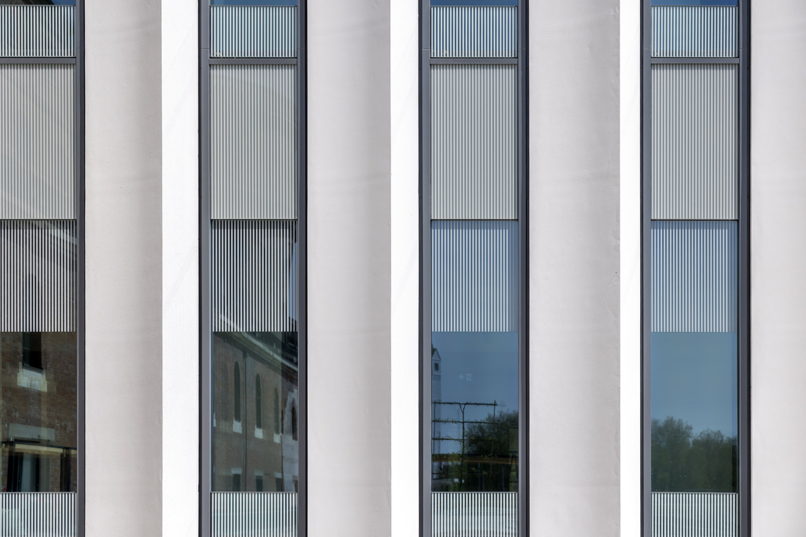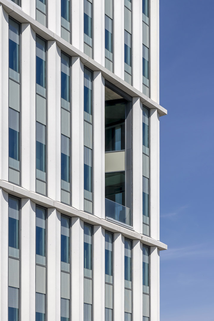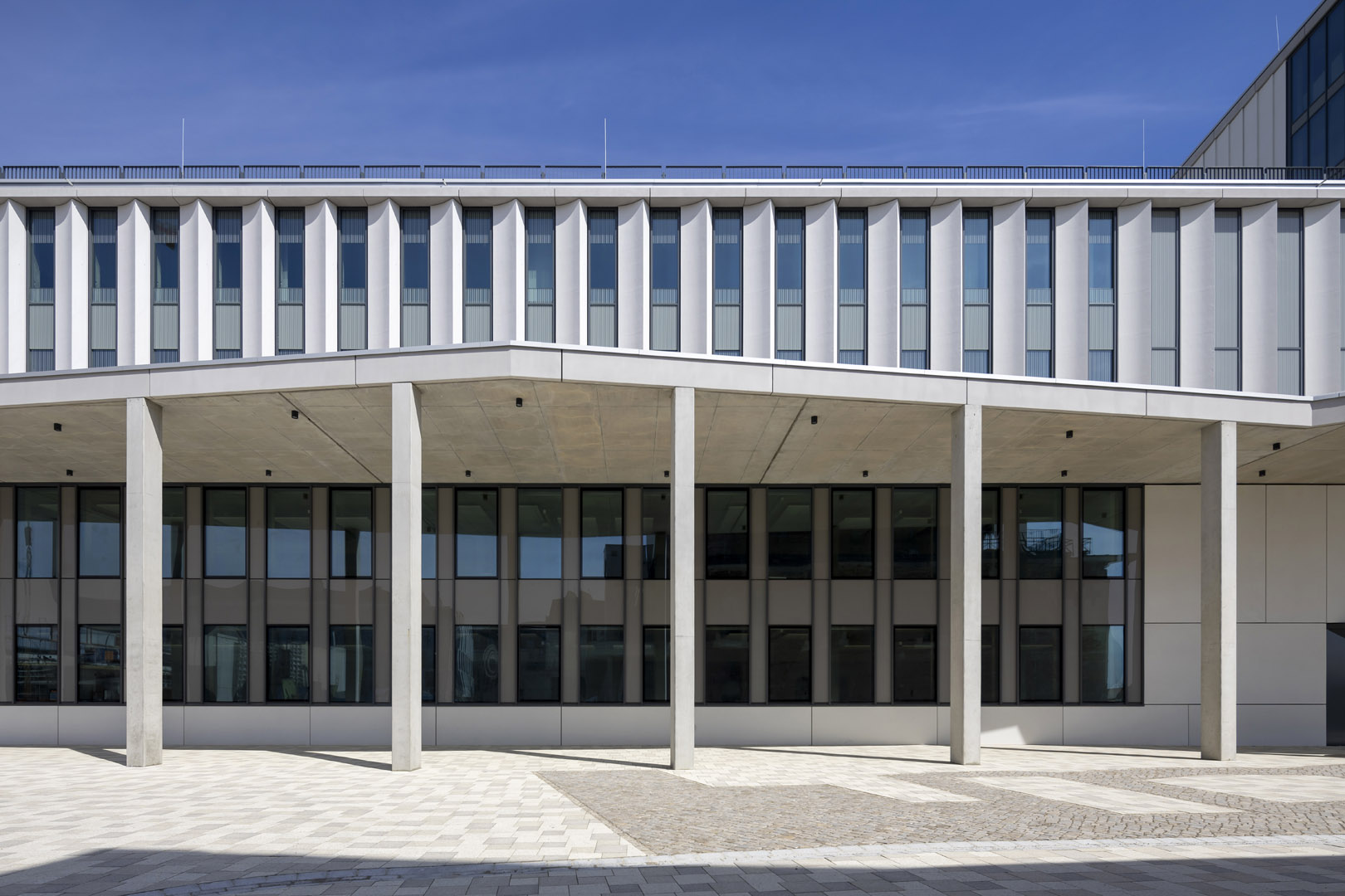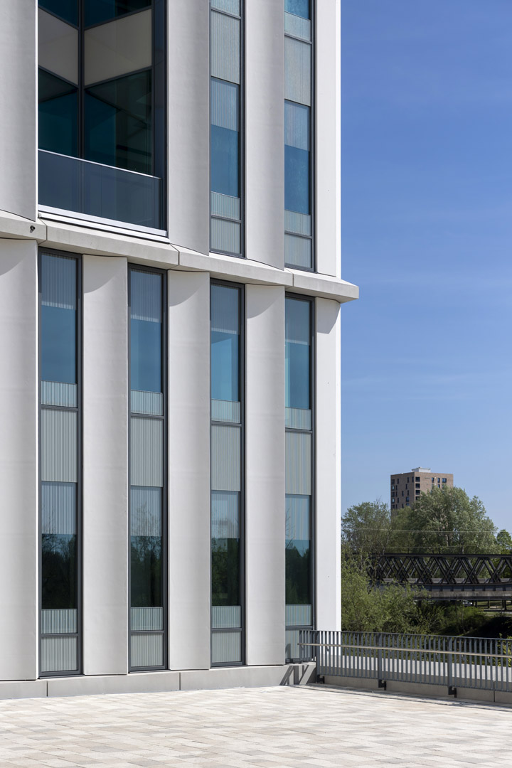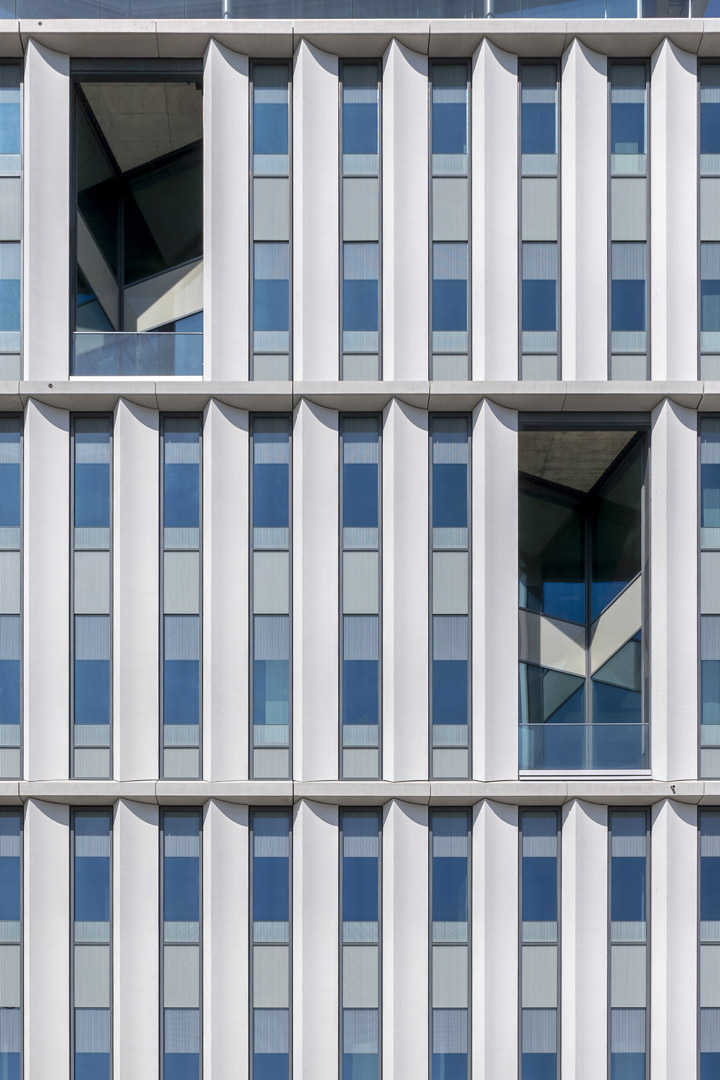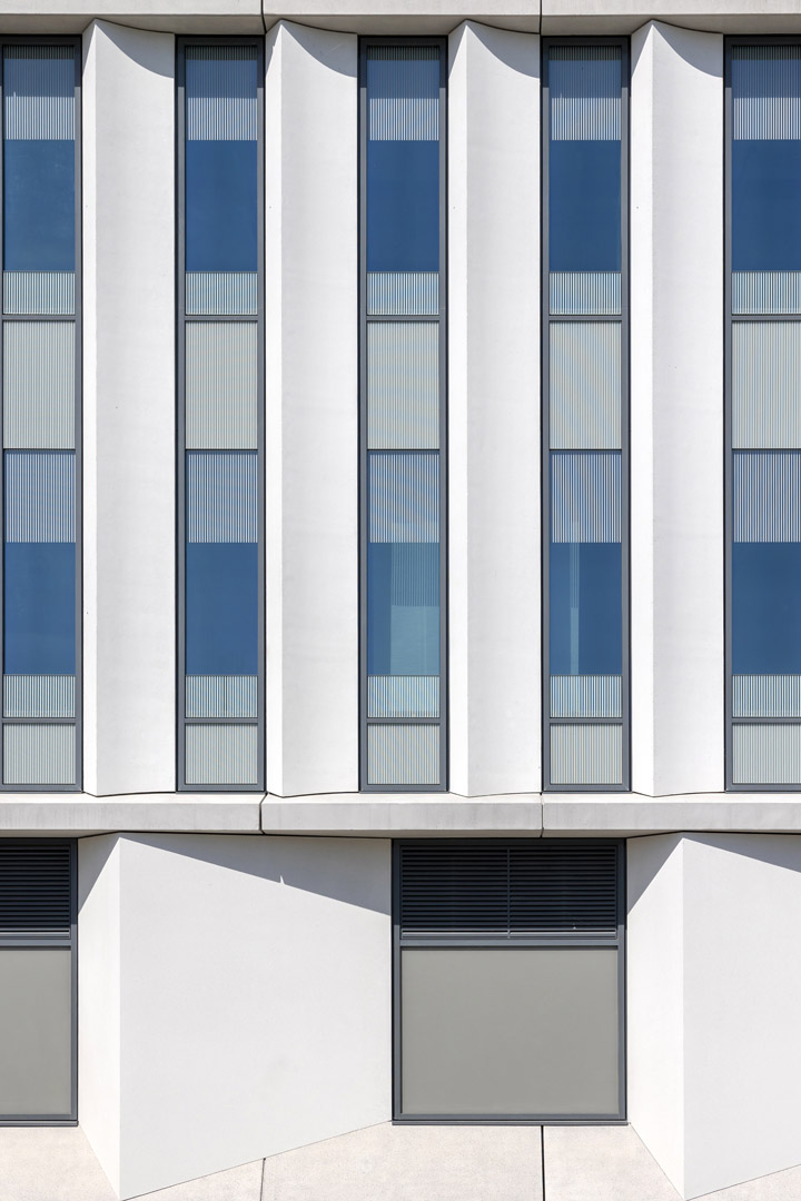 Anspruchsvoller Entwurf verlangt individuelle Fassadenlösungen. Der Entwurf sah schlanke Fensterbänder mit filigranen Profilansichten vor, daher wurde eine gestaltprägende Glas-Aluminiumfassade ausgeführt. Jeweils zwei Einzelelemente wurden zu einem Pfosten-Riegel-Element zusammengefügt, um dem geschossübergreifenden Raster der Betonelemente zu folgen. Aufgrund der vielfältigen gestalterischen und funktionalen Anforderungen entwickelte das Gebrüder Schneider Planungsteam darüber hinaus zahlreiche Sonderlösungen und Eigenkonstruktionen. Am Ende wurden 40 unterschiedliche Glastypen geplant, 170 Doppelelemente installiert und rund 1.100 Fensterelemente im Eingangsbereich sowie im Sockelgeschoss in Stahlprofilen verbaut.