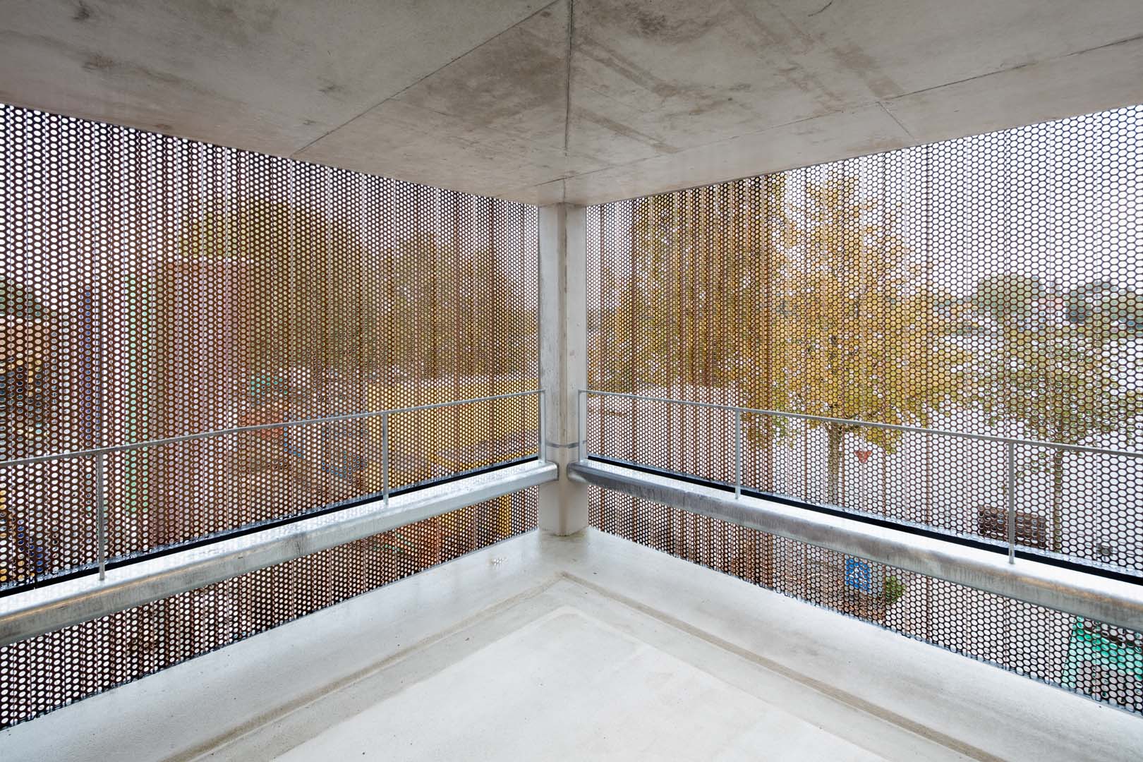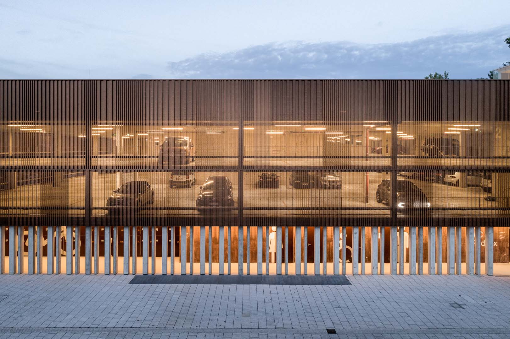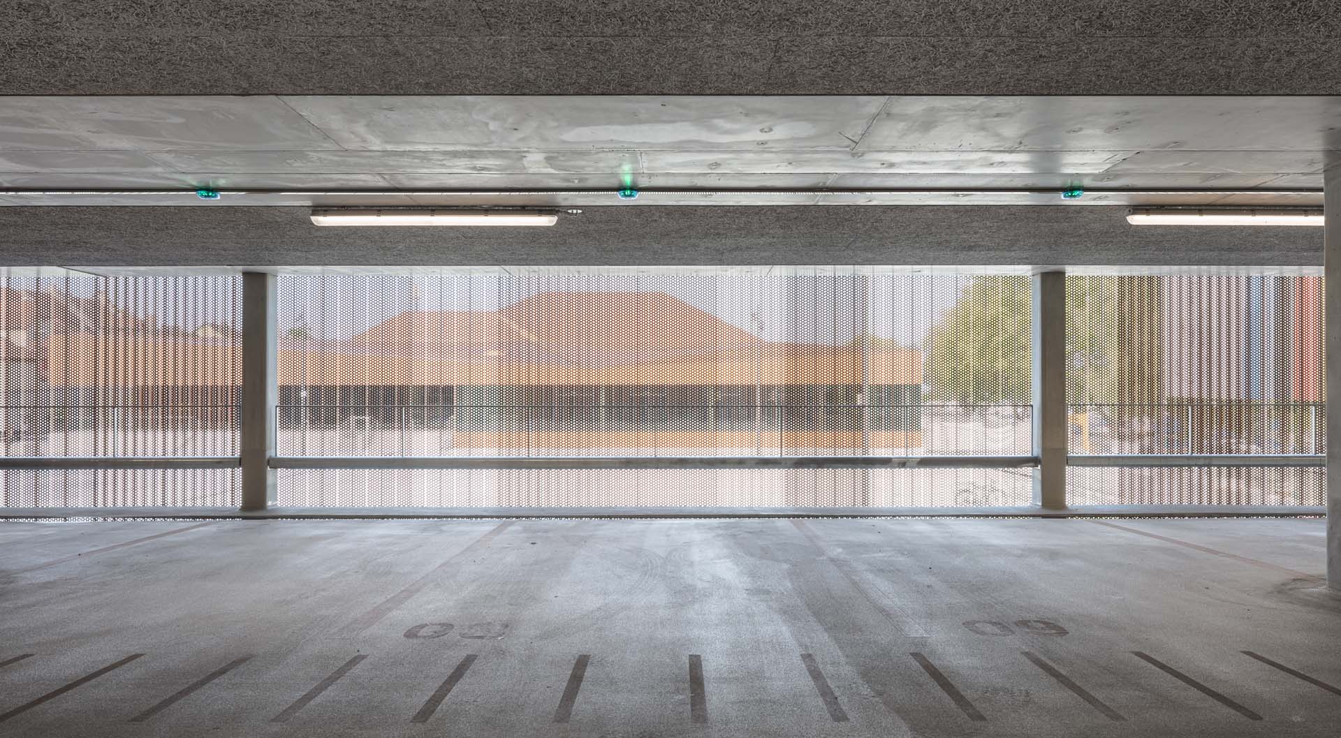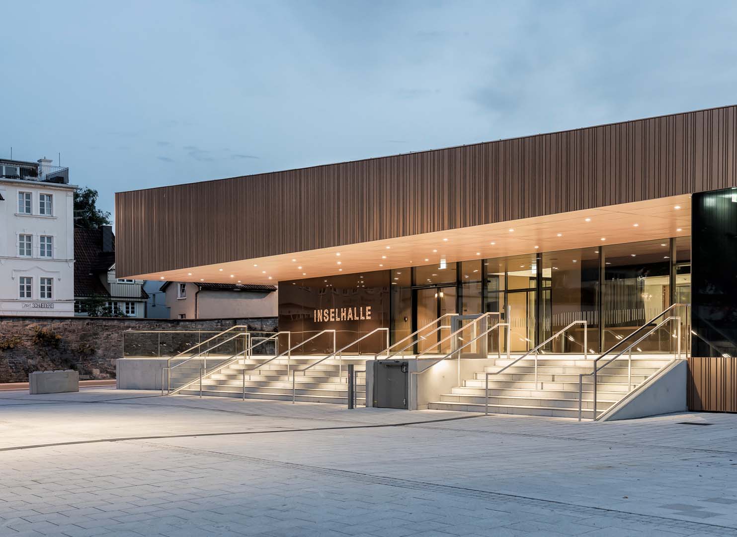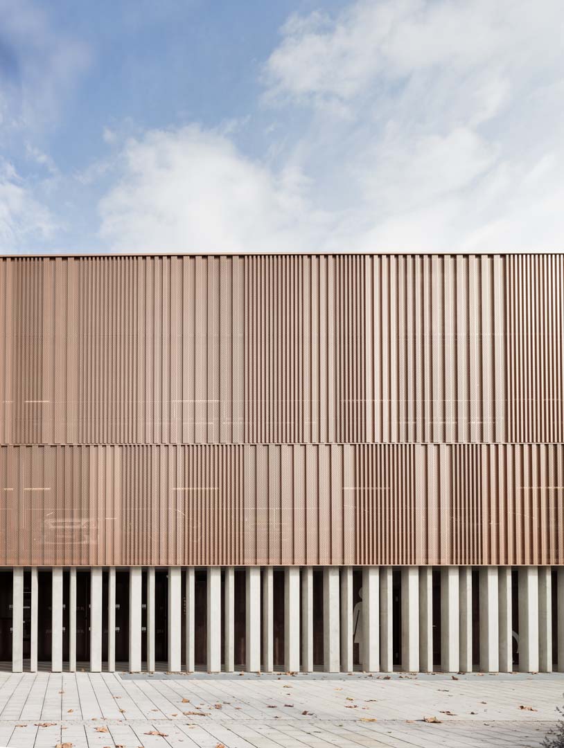 Kupfer für die Fassaden bestimmt das Erscheinungsbild. Farben und Materialien des neuen Ensembles beschränken sich auf Schwarz, Weiß, Grau, das von den Ziegeldächern der Altstadt abgeleitete Kupferdach und die im Saal dominierende Eiche. Das Metallische des Hallendachs findet sich an der von Schneider realisierten Blechfassade von Inselhalle und Parkhaus wieder. Pulverbeschichtete und gekantete Aluminiumbleche sowie schmale, kupfern schimmernde Aluminiumbänder geben den Gebäuden einen warmen, lebhaften Charakter. So einheitlich das Bild heute erscheint, so divers waren die Herausforderungen für Planung, Fertigung und Montage der Blechfassade. Die verschiedenen Befestigungsuntergründe Stahl, Beton und Trockenbau erforderten angepasste Berechnungen der Bewegungs- und Toleranzaufnahmen. Darüber hinaus war aufgrund der Form und der vielen Gebäudeecken kaum ein Teil identisch. Die Aufteilung der verglasten Aluminium-Pfosten-Riegel-Fassade mit Vogelschutzsiebdruck sollte perfekt mit dem Kantblech harmonieren und beim Parkhaus musste das Lochmuster der Blechfassade genau auf der Kante sitzen.