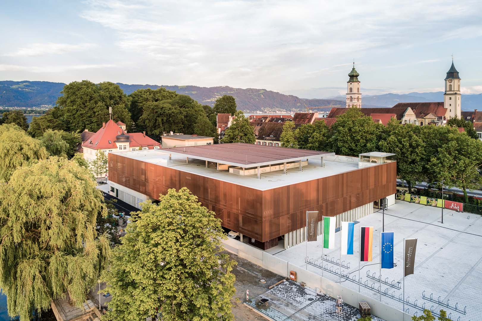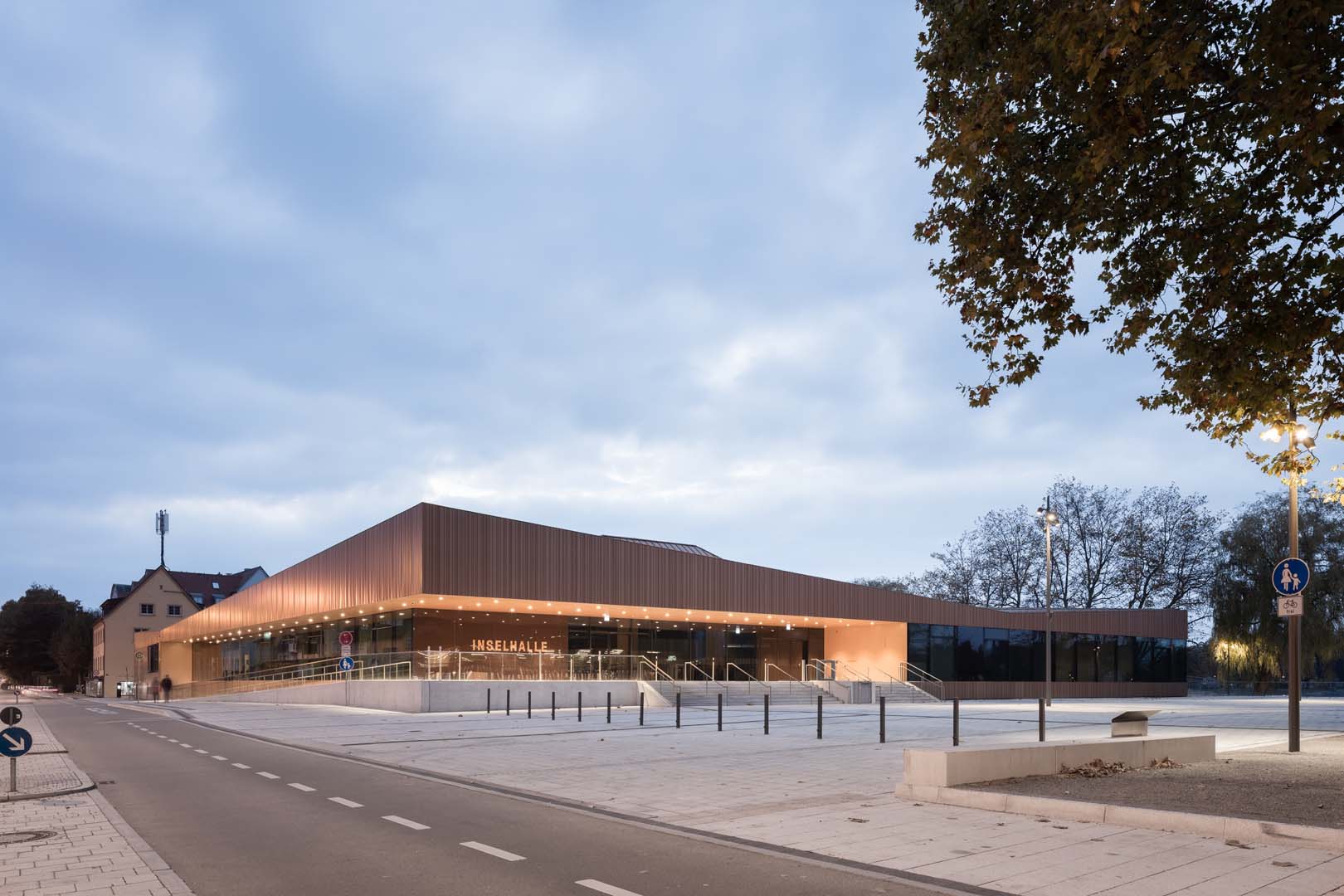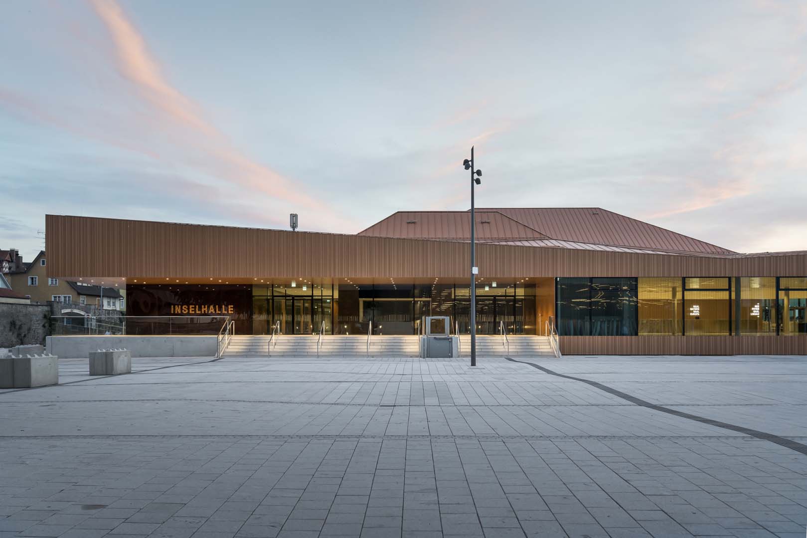 Jedes Jahr treffen sich Nobelpreisträger mit Jungwissenschaftlern in der Inselhalle. Wer möchte nicht in einer idyllischen Umgebung tagen, mit Blick auf Wasser und Berge. Doch dazu braucht es in der heutigen Zeit eine zeitgemäße Konferenzlocation und die alte Inselhalle Lindau erfüllte diese Kriterien nicht mehr. Nach dreijähriger Sanierung wurde das Tagungshaus 2018 mit der Möglichkeit flexibler Raumeinteilung und modernster Technik wiedereröffnet. Auer Weber Architekten beließ den eigentlichen Saal weitgehend unverändert, es wurden nur bodentiefe Türen zum See hin integriert. Das neu gebaute, vollverglaste Foyer, Halle und Nebengebäude fassten die Architekten über polygonal gefaltete, kupferfarbene Dachflächen aus Aluminiumblech zusammen und griffen so die bestehende Dachform auf. Auf der gegenüberliegenden Seite des frisch gestalteten Vorplatzes wurde ein Parkhaus mit Feuerwache und Bootsanlieger errichtet.