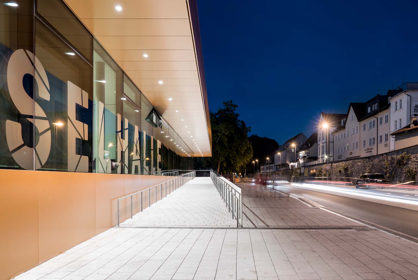 Sanierung und Erweiterung Inselhalle: verglaste Aluminium-Pfosten-Riegel-Fassade, Aluminium-Kantblech-Kalt-Fassade, Foyer: verglaste Stahl-Pfosten-Riegel-Dach-Fassade, Parkhaus: UG und EG in Aluminium-Fenster-/Türkonstruktion, 1.-3.OG mit Sonder-Aluminium-Loch-Kantblech-Kalt-Fassade (Blechfassade).